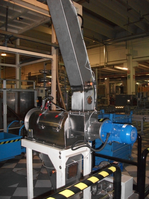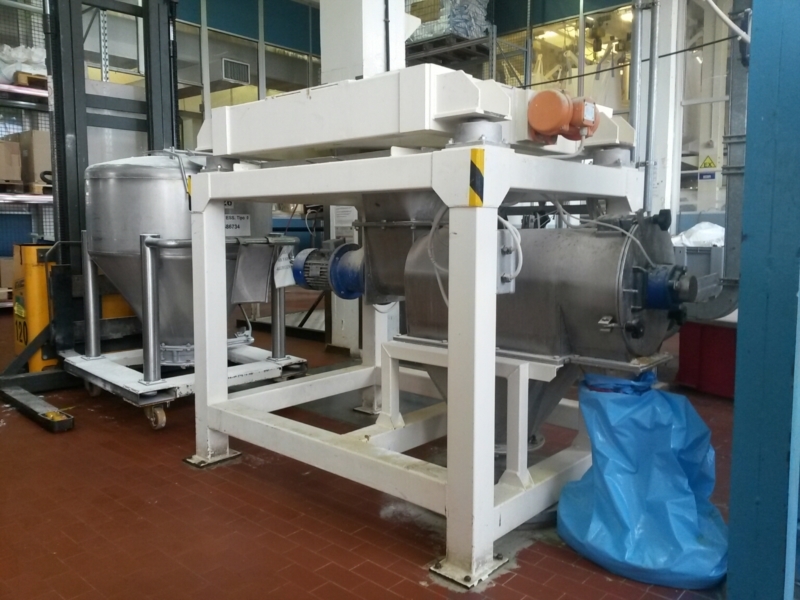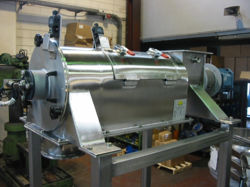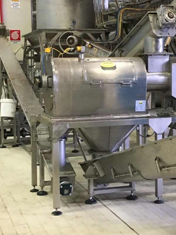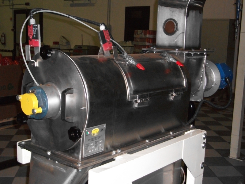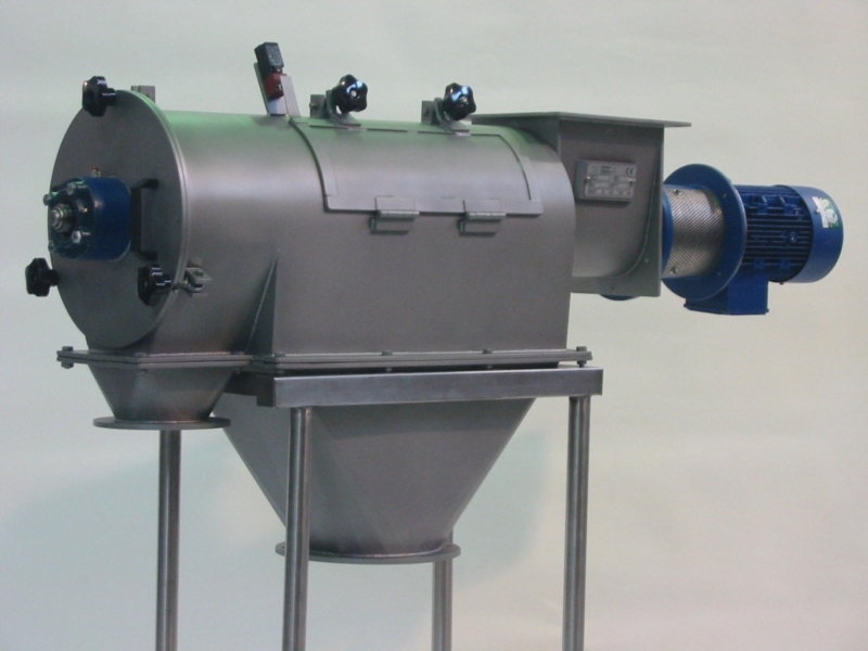 The operating principle of the rotary separator is extremely simple. The product is fed into the machine from the loading mouth and, through an auger, is sent to sieving chamber, consisting of a mesh drum. Here, stirred by special rotating bars, the product comes into contact with the mesh, letting through the "fine" fraction, which shall be discharged from the main mouth. Impurities, instead, are held back and, proceeding inside the mesh are then conveyed to the secondary discharge mouth. The sieving machine is equipped with compressed air connectors in the front and rear section, to keep the powder away from bearings.
